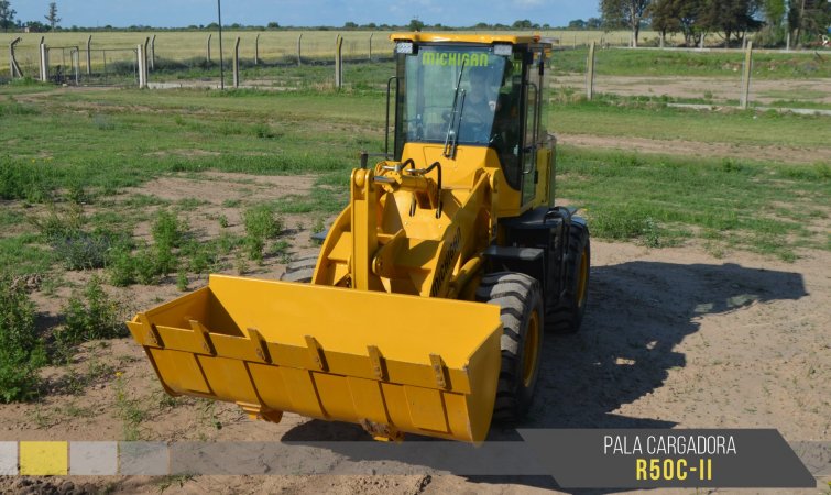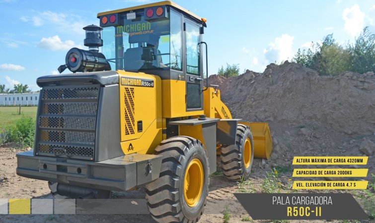 La pala cargadora Michigan R50C-II se mueve con un motor Hanomag aspirado de 4 cilindros (4.300 cc, 90HP) y transmisión Powershif 4WD (2+2 velocidades), con la que alcanza una velocidad de crucero de 6/24 km/hora. Dispone de un balde frontal de 1 m3 (2000 kg de capacidad de carga) alcanzando una altura máxima de carga de 4,32 mts y una altura de descarga de 2,90 mts)