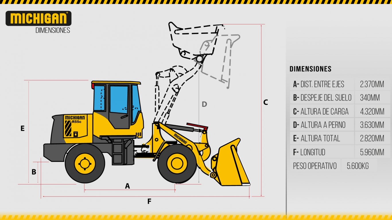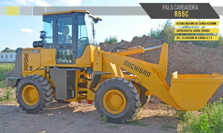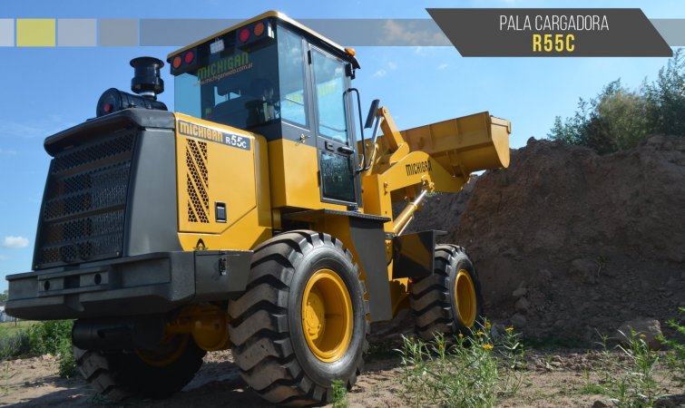 La pala cargadora Michigan R55C se mueve con un motor Cummins aspirado de 4 cilindros (3,900cc – 100HP) y transmisión Powershift 4 WD (2+2 velocidades) con la que alcanza una velocidad de crucero de 8.5/24 km/hora.