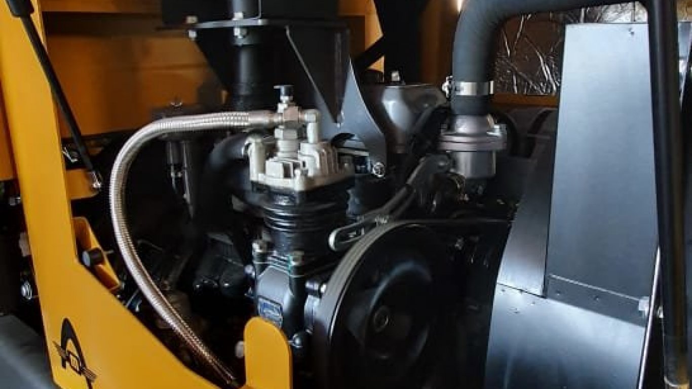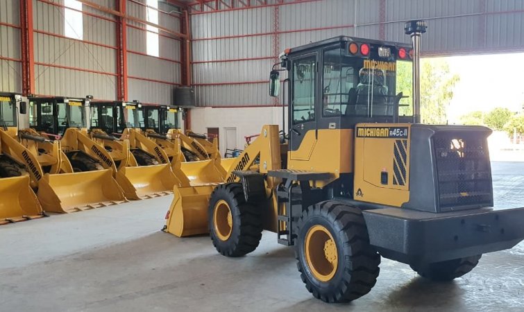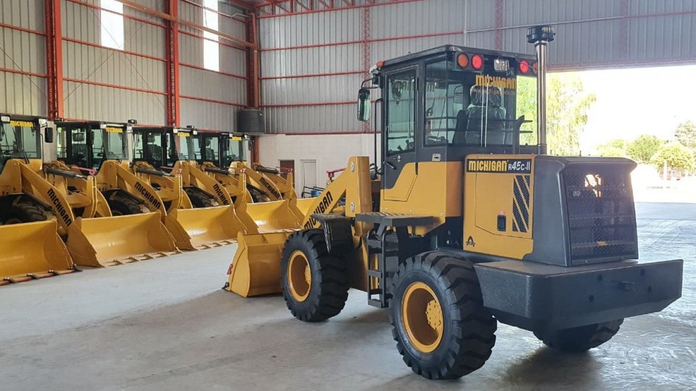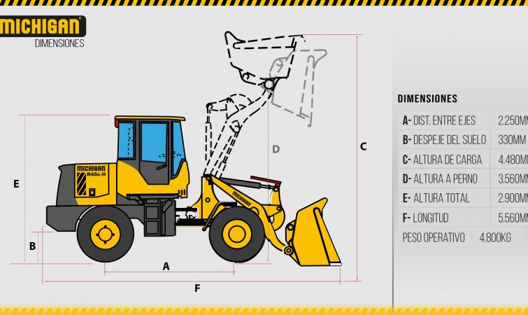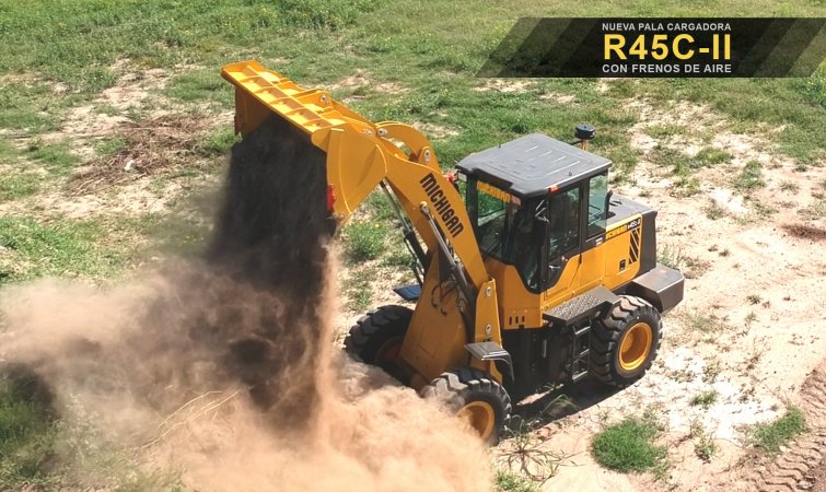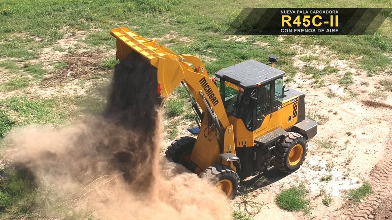 La pala cargadora Michigan R45C-II se mueve con un motor Hanomag A498BG aspirado de 4 cilindros (3.168 cc, 54 HP, 193 Nm) y transmisión Powershift 4WD (2+2 velocidades) con la que alcanza una velocidad de crucero de 6/35/hora.
